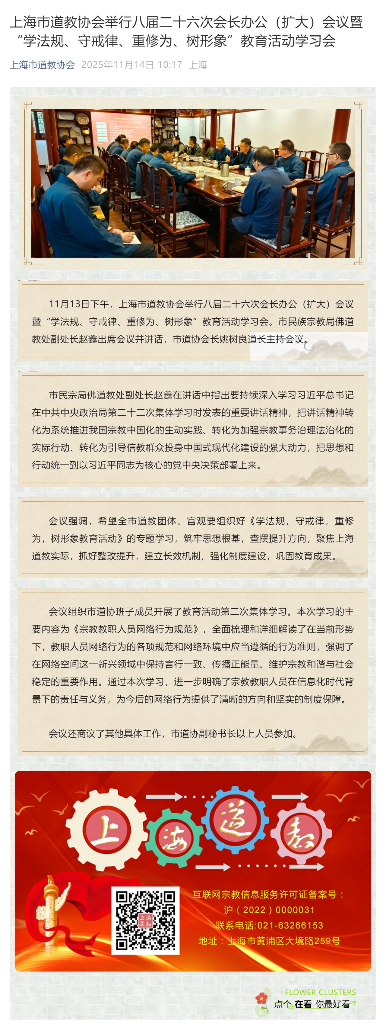 上海市道教协会举行八届二十六次会长办公(扩大)会议暨“学法规、守戒律、重修为、树形象”教育活动学习会