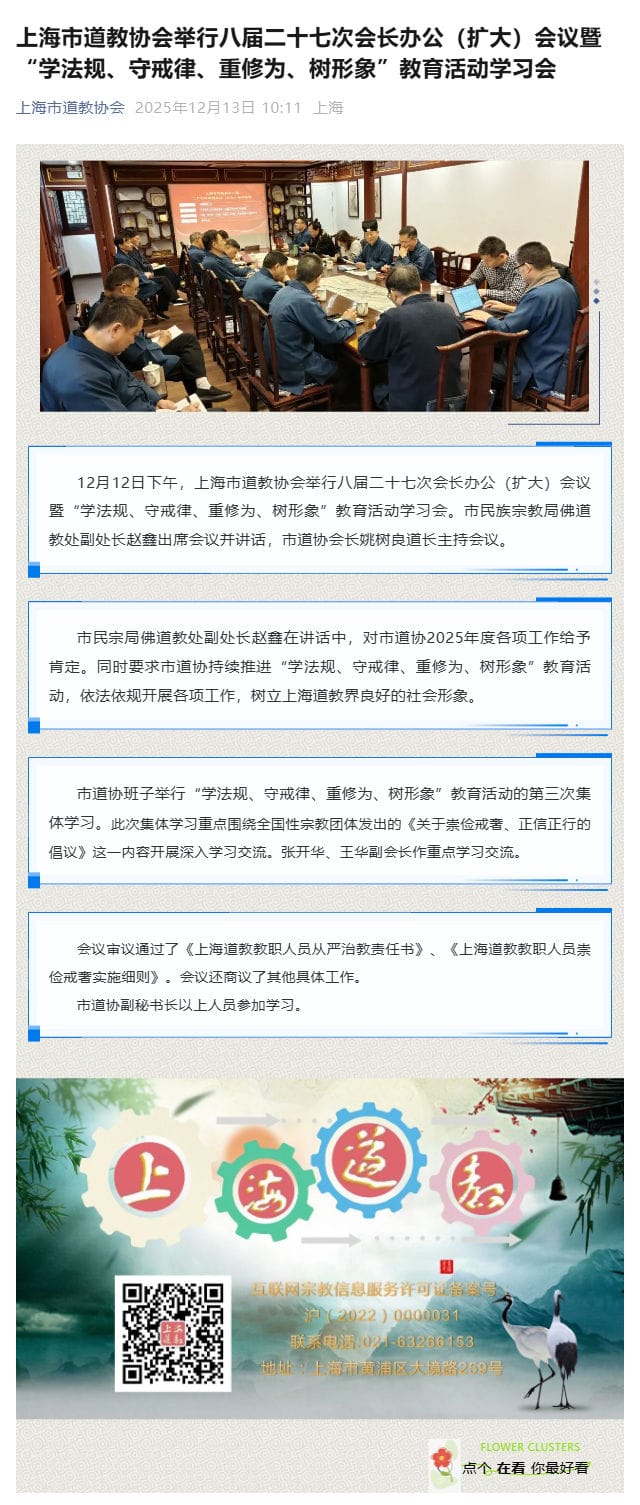 上海市道教协会举行八届二十七次会长办公(扩大)会议暨“学法规、守戒律、重修为、树形象”教育活动学习会